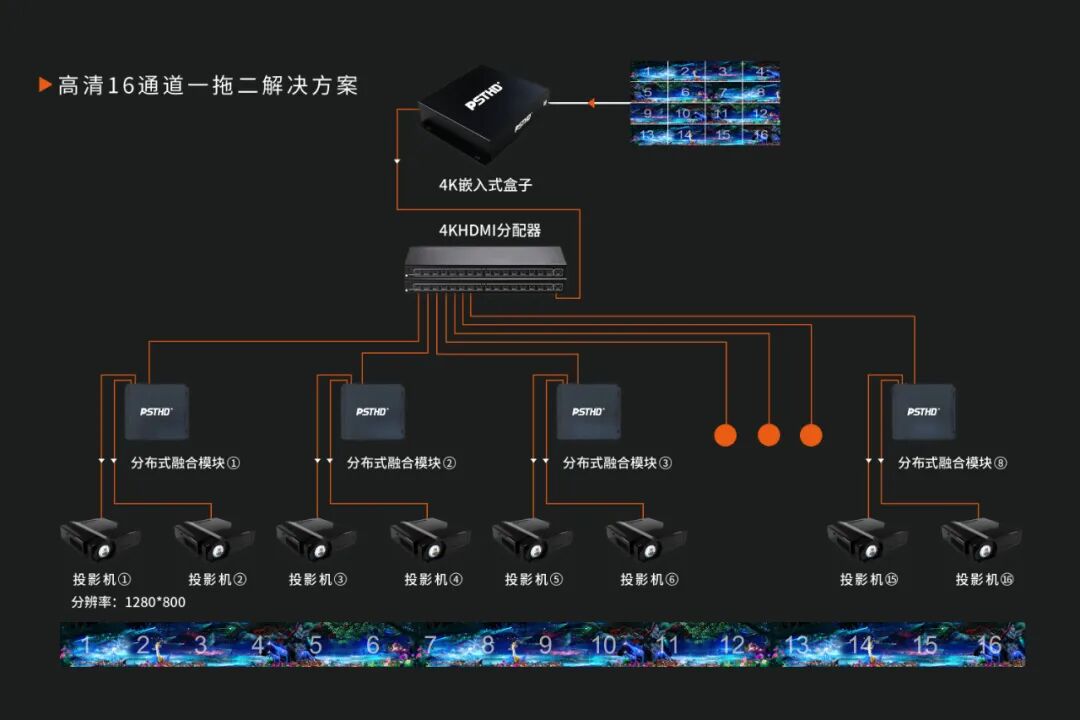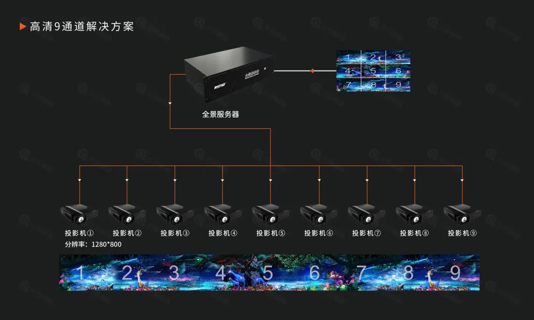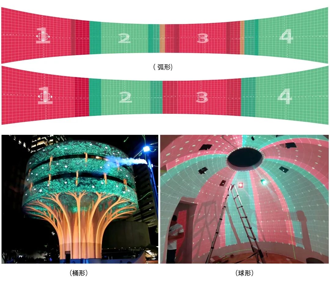 配合自主研发的软硬结合式的几何矫正技术,多通道弧形投影边缘融合机能够 完善的实现高性能的多通道弧形,桶形,球面和其他任意多通道异形投影,可以 应对几乎任何复杂的投影应用。