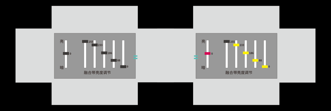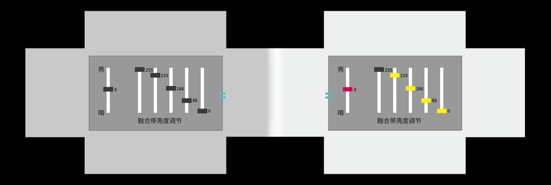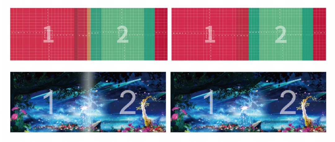 在纯黑环境下,投影机仍有一部分光线射到投影幕上,使中间出现一个亮带。我 们能提升非叠加部分光强来抵消此亮带,使图像画面在纯黑时一致。投影机在 经过几何矫正后会出现漏光带,可以调节漏光带的上下不同宽度。然后再提升 漏光带的黑电平,和融合区与非融合区保持一致。